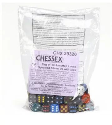 Chessex Speckled Bags of 50 Asst. Dice - Loose Speck. 16mm d6 w/pips Dice