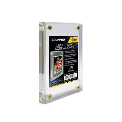 The Lucite Brik Screwdown features a 130pt recessed area with diamond corners and is designed to hold standard cards 2-1/2' x 3-1/2". Superior quality Lucite slabs with four-screw closure on each corner and beveled edges for a premium look. Lucite has special additives to protect your valuables from harmful UV rays. Can be displayed vertically or horizontally.