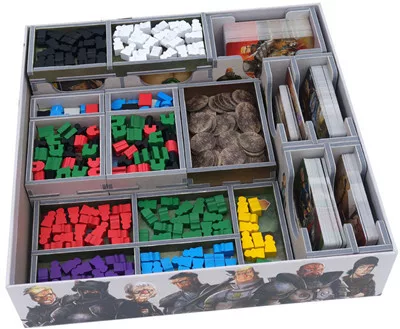 A tálcák alsó rétegében. Van hely minden kártyának, és minden játékos kap egy saját tálcát a bábui számára. Minden alkatrésznek megvan a saját tálcája, és a tálcák kivehetők a dobozból a játék előkészületeinek megkönnyítése érdekében. Az érmetálca ugyanolyan jól működik a fém ezüstérmékkel is.