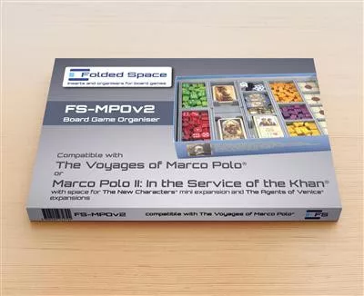 Insert is separately compatible with Marco Polo II: In the Service of the Khan. Note: When fully loaded with the original game and both expansions the box lid does not fully close flush with the box. There remains a 3-4 mm gap due to the additional board of The Agents of Venice® expansion. Insert features: