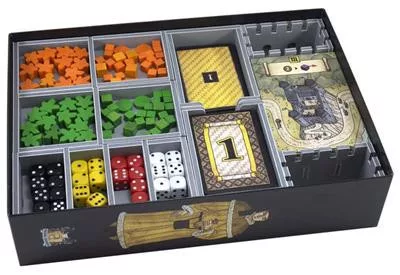 Insert compatible with Troyes®, and The Ladies of Troyes® expansion. The design provides both efficient storage and improved game play. Many of the trays can be utilised during the game, and they greatly aid set-up and clear-away times. The rules and boards act as a lid on top of the trays. There is one large tray for the activity deck, one for the event cards, and one for the other cards. All cards can be sleeved with quality sleeves. The citizen meeples, and player cubes & discs are stored in separate slots. There are two identical trays for the dice and the victory point tokens. The neutral citizens and cubes & discs have their own tray together with the purple dice. The last tray is for the denier tokens, with separate slots for the 1 denier tokens and the 5 & 10 denier tokens. the filler tray goes at the end of the box. It is themed to resemble the castle entrance and bridge from the left hand side of the main game board. It also acts to store the outdoor activity tiles from The Ladies of Troyes® expansion. When clearing the game away and packing the box, the game board goes on top of the trays acting as a lid. On top of these place the rulebooks. This fills the box to the top and allows for vertical storage. This product consists of a flat-pack of 4 Evacore sheets. The trays require assembly, which is quick and fun, using ordinary PVA glue. Detailed instructions are included in the package.