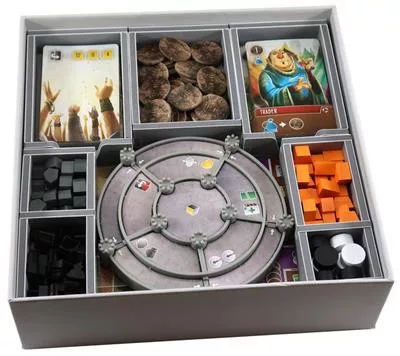 A Viscounts of the West Kingdom®-val kompatibilis betét. A kialakítás hatékony tárolást és jobb játékélményt biztosít. A tálcák közül sok használható a játék során, és nagyban segítik az előkészítést és az elpakolást.
