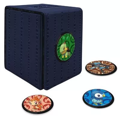 Collect, store, and personalize with the Alcove Click for Pokémon! The Alcove Click comes with four themed badges featuring Turtwig, Chimchar, Piplup and Riolu. This Deck Box holds up to 100 standard size trading cards double-sleeved in Ultra PRO Deck Protector® sleeves, features a strong magnetic closure, and has dual thumb notches for easy access to your deck. Personalize your Alcove Click by popping on your favorite magnetic badges and replacing them with other badges. badges have a 1.5 in. diameter.