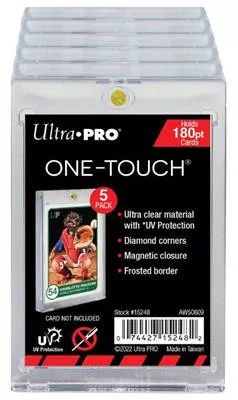 Ultra PRO's ONE-TOUCH holders are premium trading card storage cases designed as the final destination for your collectible trading cards. The two-piece ONE-TOUCH holders are uniquely designed with slide-in hinges and magnetic closure so you'll never have to use a screwdriver again. The holder uses UV-blocking additives to protect your card from harmful UV-rays, and is made with non-PVC materials to provide acid-free protection - ensuring your valuable hit retains its condition while under display. Our ONE-TOUCH holders are ideal for presenting prized and super rare gaming cards as well. This model can hold standard cards (2-1/2" X 3-1/2") up to 180pt in thickness. Each pack comes with five (5) individual ONE-TOUCH holders.
