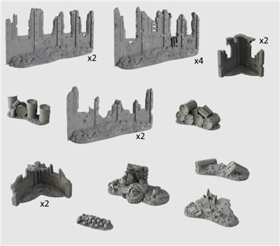 18 pieces of detailed and ready-to-paint PVC terrain.